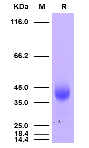 理論分子量為36.7kDa(原形)和29.5kDa(成熟形),由于糖基化,SDS-PAGE還原電泳分子量大小為42-50kDa和34kDa。