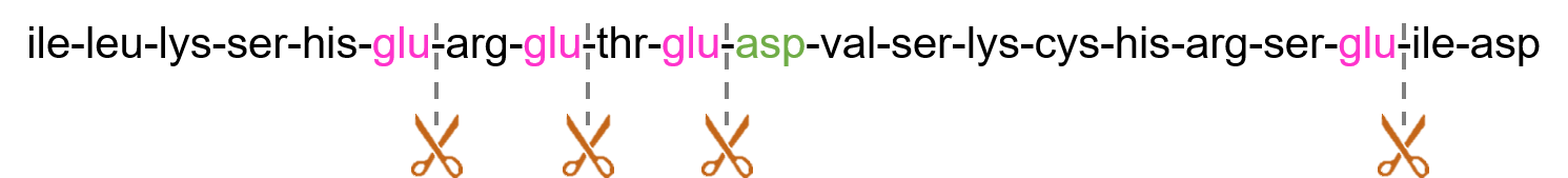蛋白內(nèi)切酶Glu-C(又稱V8蛋白酶、谷氨酰胺內(nèi)切酶、天冬酰胺內(nèi)切酶、金黃色葡萄菌V8蛋白酶)屬于絲氨酸蛋白酶家族,能特異水解谷氨酸(Glu)或天冬氨酸(Asp)殘基羧基端肽鍵。其特異性受緩沖液組分直接影響,在pH7.8的NH4HCO3和pH4.0的CH3COONH4緩沖液中識別并切割Glu羧基端肽鍵,在pH7.8的磷酸鹽緩沖液中識別并切割Glu或Asp羧基端肽鍵,且對Glu的水解速率高于Asp。